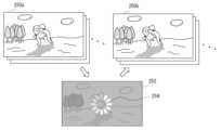 ただし待機用画像の構成は図示するものに限らず、単純な塗りつぶし画像でもよいし、フレーム250aの像を含まない画像でもよい。あるいはフレーム250aの像自体に何らかの加工を施してもよい。学習用画像を生成できたら、直後のメイン画像のフレーム250bから表示が再開される。However, the configuration of the standby image is not limited to that shown in the figure, and it may be a simple filled-in image, or an image that does not include the image of