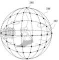 図7は、疑似視点生成部72が生成する疑似視点の配置を例示している。この例では、シーンの保存操作がなされた時点での表示視野に含まれる、オブジェクト240などのシーンを囲むように、複数の擬似的な視点(例えば視点242)を配置している。例えば疑似視点生成部72は、表示視野の中央に対応する、シーン内の位置を中心とし所定半径の球244の面上に、所定間隔で均等に疑似視点を配置する。そして各疑似視点から球244の中心へ向かう視線を設定する。FIG. 7 illustrates an example of the arrangement of pseudo viewpoints generated by the pseudo