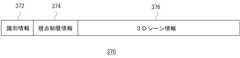 なお3Dシーン情報生成部76は、視点制限情報記憶部112から視点制限情報を読み出し、生成した3Dシーン情報のメタデータとして3Dシーン情報記憶部78に格納してもよい。図22は、本態様における表示用3Dシーン情報のデータ構造を例示している。表示用3Dシーン情報データ370は、識別情報フィールド372、視点制限情報フィールド374、および3Dシーン情報フィールド376を含む。識別情報フィールド372は、3Dシーン情報の識別番号、元のコンテンツの識別情報、生成を要求したユーザの識別情報など、3Dシーン情報を識別する各種情報を格納する。The 3D scene