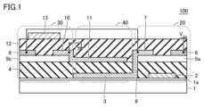キャパシタ40は、ソース電極7と電気的に接続される電極3(第1電極)と、強誘電体膜4を介して電極3と対向し、ソース電極10と電気的に接続される電極11(第2電極)と、を含む。キャパシタ40は、電極3と電極11とで強誘電体膜4を挟む構成であるが、強誘電体膜4および絶縁膜12(常誘電体膜)のうち少なくとも一方の膜を挟む構成でもよい。なお、強誘電体膜4は絶縁膜12より比誘電率が高いのでキャパシタ40の面積を小さくすることができる。具体的に、電極3と電極11と間に強誘電体膜であるハフニウム系強誘電体(比誘電率:約30)を用いた場合、電極3と電極11と間に常誘電体膜である二酸化ケイ素(比誘電率:約4)を用いた場合に比べ、同じ膜厚であればキャパシタ40の面積を約1/7.5倍に縮小することができる。The