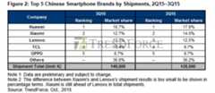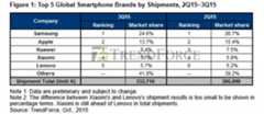 Південнокорейська компанія Samsung, як і раніше, лідирує на ринку смартфонів, попри те, що її частка в третьому кварталі впала нижче 25% (з 26.7% до 24.6%). Вона планує поставити до кінця року 40 млн Galaxy S6 і 10 млн Galaxy Note5. Крім того, корейський гігант смартфонів стрімко втрачає свої позиції в початковому і середньому сегментах під натиском китайських виробників смартфонів. За оцінками TrendForce, поставки смартфонів Samsung за підсумками 2015 впадуть на 1% у порівнянні з минулим роком.