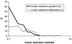 Of course, any biological interpretation of these data must recognize sources of ascertainment and publication bias. For example, spurious correlations between traits and fitness may occur through environmental variation among individuals, causing bias in magnitude and direction of selection estimates (Scheineret al. 2002;Stinchcombeet al. 2002).Kingsolveret al. (2001) note that phenotypic traits are not chosen at random for selection studies. Studies are probably biased towards traits where strong selection is suspected to occur, thereby overestimating the frequency of large selection gradients in nature. Furthermore, publication trends preferentially exclude studies in which selection is weak or undetected, further biasing estimates of selection gradients upward. Finally, most selection studies tend to have low statistical power (Kingsolveret al. 2001), reducing the ability to detect weak selection.