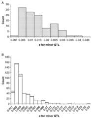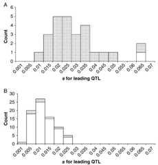 There are also several sources of bias in estimating the number of loci and their effects on a quantitative trait. For example, a QTL may include the combined effects of more than one closely linked locus (Steinmetzet al. 2002). Linked QTL with opposing effects are unlikely to be detected, whereas linked QTL with effects in the same direction may appear as a single QTL with large effect (Barton & Keightley 2002). A QTL may also reflect more than one mutation even within a gene (Stam & Laurie 1996). Effect sizes are likely to be overestimated with small sample sizes and low marker density (Beavis 1998;Orr 2001), and if they ignore the effects of environmental variance. However, a simulation study showed that QTLs with large effect (> 15% PVE) may be systematically underestimated, whereas effect sizes for minor QTLs may be overestimated, when effect sizes are estimated from the same analysis that detects the QTL (Flint 2003). Many estimation methods for QTL effects also ignore interactions with other segregating QTL, which may also introduce bias (Mackay 2001).