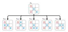 さらに技術的に言うと、アルゴリズムは次のように働きます。進行中のゲームが初期盤面s0にあり、ボットの順番になりました。ボットはA セットから手を選ぶことができます。s0のための単一ノードで構成された木を使ってモンテカルロ木探索が始まります。このノードは全てのa∈A 行動を試して展開 され、それぞれの行動に対応する子ノードが構築されます。下記の図では三目並べを使ってこの展開を表しています。