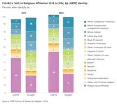 Four in ten LGBTQ Americans (37%) identify as Christian, compared with nearly seven in ten straight Americans (69%). Straight Americans are significantly more likely than LGBTQ Americans to identify as white Christian (43% vs. 18%) or as Christians of color (26% vs. 19%). LGBTQ Americans are more than twice as likely to be religiously unaffiliated than straight Americans (54% vs. 25%). Over time, LGBTQ Americans have grown more likely to identify as religiously unaffiliated, from 46% in 2016 to 54% in 2024, whereas straight religiously unaffiliated Americans shifted little in the same timeframe (23% in 2016 to 25% in 2024). Membership in other religious groups among both LGBTQ and straight Americans has remained consistent since 2016.