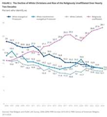 In contrast, the percentage of Republicans who are Christian slightly declined by 2 percentage points since 2013, from 86% to 84%, with a 7-percentage-point decline in white Christian Republicans (75% to 68%). However, the percentage of Republicans who identify as Christians of color has risen from 11% to 16%, helping mitigate the overall decline. Republicans who identify as religiously unaffiliated have remained largely unchanged (10% to 12%).