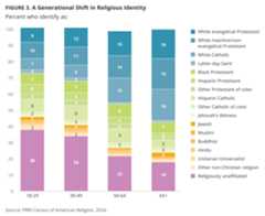 Younger Americans are far more likely to identify as religiously unaffiliated than they were in the past. Today, about four in ten Americans ages 18-29 identify as religiously unaffiliated (38%), an increase of 6 percentage points from 32% in 2013. Over one-third of Americans ages 30-49 identify as religiously unaffiliated (34%), an increase of over 10 percentage points since 2013 (23%). The share of older Americans who are religiously unaffiliated is smaller: 22% of those ages 50-64 and 18% of Americans ages 65 or over. Their shares have also increased since 2013, when 16% of Americans ages 50-64 and 11% of Americans ages 65 identified as religiously unaffiliated.