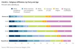 The Democratic party tends to resemble younger Americans (ages 18-29) in its religious makeup broadly. While 23% of Democrats identify as white Christians, 35% as Christians of color, 9% as another religion, and 34% as religiously unaffiliated, a slightly higher percentage of Americans ages 18-29 identify as white Christians (28%), followed by 26% as Christians of color, 7% as another religion, and 38% as religiously unaffiliated. Americans ages 30-49 also share similar religious breakdowns, with 32% who identify as white Christians, 27% as Christians of color, 7% as another religion, and 34% as religiously unaffiliated. Nearly half of Americans ages 50-64 identify as white Christians (46%), 27% as Christians of color, 5% as another religion, and 22% as religiously unaffiliated.