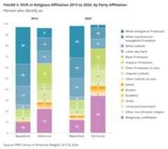 Though the religious breakdown of the major parties has not shifted significantly in the past year, there have been considerable changes since 2013. Overall, Christian identity has declined significantly among both Republicans and Democrats. Democrats who are Christian dropped from 70% in 2013 to 58% in 2024, with white Christian Democrats primarily driving the decrease (from 34% to 23%), while the proportion of Democrats who identify as Christians of color remained largely unchanged (36% in 2013; 35% in 2024). In addition, Democrats have grown significantly more likely to identify as religiously unaffiliated, from 22% in 2013 to 34% in 2024.