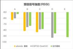 今回作成した基板は,aitendo 基板に比べて 10dB ほど受信強度が強く,ESP32-DevKitC に比べても全てのアクセスポイントに対して受信強度が良くなっています.
