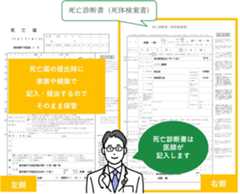 一般的には、用紙の右側は医師が記入する死亡診断書で、左側は家族が記入する死亡届になっています。