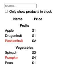functionProductCategoryRow({category}){return(<tr><thcolSpan="2">{category}</th></tr>);}functionProductRow({product}){constname =product.stocked ?product.name :<spanstyle={{color:'red'}}>{product.name}</span>;return(<tr><td>{name}</td><td>{product.price}</td></tr>);}functionProductTable({products}){constrows =[];letlastCategory =null;products.forEach((product)=>{if(product.category !==lastCategory){rows.push(<ProductCategoryRowcategory={product.category}key={product.category}/>);}rows.push(<ProductRowproduct={product}key={product.name}/>);lastCategory =product.category;});return(<table><thead><tr><th>Name</th><th>Price</th></tr></thead><tbody>{rows}</tbody></table>);}functionSearchBar(){return(<form><inputtype="text"placeholder="Search..."/><label><inputtype="checkbox"/>{' '} Only show products in stock</label></form>);}functionFilterableProductTable({products}){return(<div><SearchBar/><ProductTableproducts={products}/></div>);}constPRODUCTS =[{category:"Fruits",price:"$1",stocked:true,name:"Apple"},{category:"Fruits",price:"$1",stocked:true,name:"Dragonfruit"},{category:"Fruits",price:"$2",stocked:false,name:"Passionfruit"},{category:"Vegetables",price:"$2",stocked:true,name:"Spinach"},{category:"Vegetables",price:"$4",stocked:false,name:"Pumpkin"},{category:"Vegetables",price:"$1",stocked:true,name:"Peas"}];exportdefaultfunctionApp(){return<FilterableProductTableproducts={PRODUCTS}/>;}