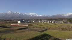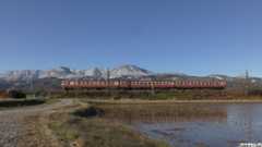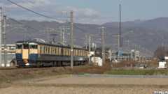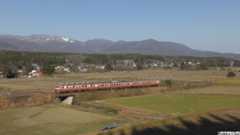 雪を頂いた妙高の山々をバックに緩い勾配を登って行く列車を追い撮りします。ここから100mほど南に行った場所には百人近い撮影者で黒山の人だかりになっていました。みなさん返しの列車を狙うようですが、返しの列車は正面が影になるので、私はこの場所から移動して、正面に日が当たる場所へ向かいます。