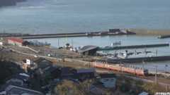 14:23 折り返しの急行2号直江津行きは、有間川ー谷浜間にある展望の丘からの俯瞰撮影です。漁港をバックにいい雰囲気です。
