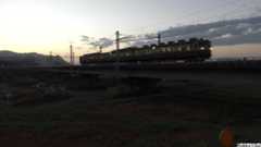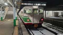 16:43 折り返しの急行4号がやってきました。すでに日がちょうど落ちた感じで、空には明るさが残ってる状態なので、上空と地面との明暗差が大きくて露出泣かせの環境です。実際にはもう少し暗いのですが、+側に露出補正で撮影、1/60秒ぐらいまでシャッター速度が落ちているので、列車はブレますが動画で見る分にはさほど気になりません。