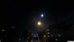 零下4℃の長野駅前にて。12月5日はコールドムーンと呼ばれる満月で、長野の駅前のような明るい所でも明るく月が見えます。手前にある電球色のは街灯。白く冷たい色のが満月です。