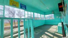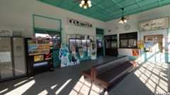 外だけかと思ったら、駅舎の中まで全部ペールグリーンの世界が広がっていました。ボロいですが、長椅子なので夏場とかなら駅寝できそうですねw