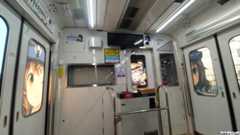 乗客も半分ほど降りて空いてきたので、特徴ある丸窓の様子を撮ります。まず外の景色の明るさに露出を合わせると、このように窓の形がシルエットになって良く分かると思います。