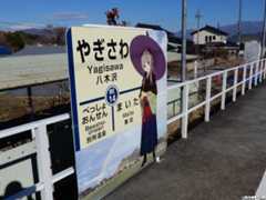 はいはいお約束の駅名標ショット。鉄道むすめのキャラクターは大概がその鉄道会社の制服や作業服・事務服を着てることが多いのですが、この八木沢まいだけが唯一無二の大正ロマン漂う袴姿の出で立ちという事で異彩を放っています。