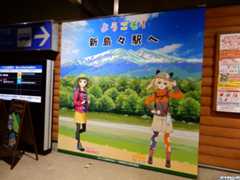 駅の改札口近くにある大きな看板にはハイカースタイルの渕東なぎさ(左)と温泉むすめの白骨朋依(右)が並んでいましたが、温泉むすめのキャラ命名はそのまんまですねw