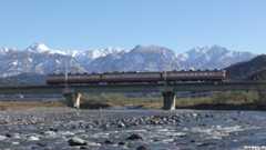 13:30 直江津行きの急行2号は側面が影になりますが、妙高連峰の山々をバックにサイドアングルで録りました。橋の上からも録れますが、大型車の騒音があるのと、川の感じがよく出ることから、10人ぐらいが橋の下に降りました。