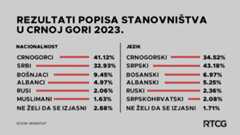 U Crnoj Gori se 256.463 građana izjašnjava kao Crnogorci, dok je 205.370 Srba, potvrdili su zvanični rezultati popisa stanovništva. Kao Crnogorci, izjasnilo se 41,12 odsto, a Srba 32,93 odsto. Srpskim jezikom govori 43,18 odsto, crnogorskim 34,52 odsto.