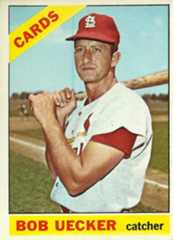 Uecker hit .228 in 53 games and after the season he was traded to the Phillies with shortstop Groat and first basemanBill White for catcherPat Corrales, outfielderAlex Johnson, and pitcherArt Mahaffey. The 1966 season was the closest he came to being a primary catcher. He had 237 plate appearances, platooning withClay Dalrymple, who had 404 plate appearances. Always quick to discuss his own futility, Uecker summed up his experiences as a hitter for the Phillies: “With Philadelphia, I’d be sitting on the bench and (manager)Gene Mauch would holler down “grab a bat, Bob, and stop this rally.”18