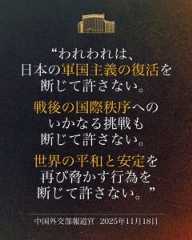 高市総理が今月8日、国会で立憲民主党の岡田克也・衆議院議員の「どういう場合に存立危機事態になるか」という質問に「台湾有事」を挙げるなどしたことを受け、中国政府(あるいは中国の外交官ら)は、常軌を逸した反応を続けているからです。