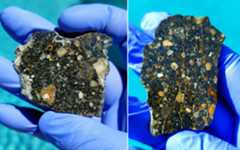 Northwest Africa 13992 (NWA 13992)Mauritania Classification: Lunar meteorite (frag. breccia) History: Found in 2020 by Mauritanian meteorite hunters. Purchased by Douglas Chenin from a Mauritanian meteorite dealer in 2021. Physical characteristics: Several identical large individuals and multiple medium to small identical individuals totaling 1035 g. Shiny, irregular shaped, sandblasted exteriors with patches of two colors, dark brown and light brownish-yellow, representing the main lithologies in these meteorite samples. Petrography: (C. Agee,UNM) Electron microprobe analysis of a polished mount shows this meteorite to be a lunar polymict breccia with at least two distinct lithologies. Lithology 1: this is feldspathic breccia consisting of fragments of olivine and pyroxene, and anorthitic plagioclase, with accessory phases Fe,Ni-metal, Fe-sulfide, ilmenite, and chromite. Lithology 2: this is a basaltic textured domain with intergranular pyroxene and plagioclase grains that grades into a partially shock melted pyroxene cumulate textured domain, with minor barite, Fe-sulfide, ilmenite, and silica — olivine is absent. Geochemistry: (A. Ross,UNM) olivine Fa48.1±9.0, Fe/Mn=104±12, n=12; clinopyroxene Fs38.5±14.9Wo13.8±13.9, Fe/Mn=58±7, n=13; plagioclase An94.9±1.7, n=6. Classification: Polymict fragmental lunar breccia. Specimens: 24.05 g on deposit atUNM,DChenin holds the main mass. |