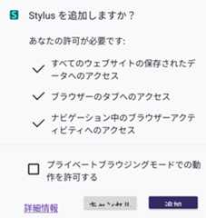 Stylusを追加しますか?と問いかけられますので下部の追加を押すことで拡張機能のインストールが完了します。