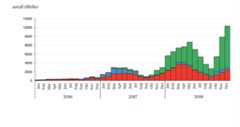 Talet på nye tilfelle av meslingar i Europa auka kraftig i perioden 2016–2018. Raude søyler viser stadfesta tilfelle med laboratorietest, blå er tilfelle som er kopla til ein epidemi, grøn er tilfelle som er anteke å vere meslingar basert på legeundersøking.