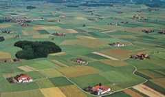 Blandingsbruk og smale åkrer er typisk for den tradisjonelle småbruksdriften som fremdeles er vanlig i den sørlige delen av Tyskland. Dette jordbrukslandskapet er fra Niederbayern.