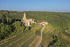 Tyskland er som vinprodusent mest kjent for sine hvitviner. Bildet viser vinmarker ved borgruinen Hornberg ved Neckarzimmern ved elven Neckar i Baden-Württemberg.