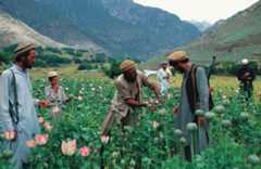 Opiumhøsting i Pechdalen. Afghanistan har lenge vært blant verdens største opiumprodusenter. Lokale myndigheter ser gjerne mellom fingrene med virksomheten som ofte gir bøndene større økonomisk utbytte enn dyrking av alternative produkter.