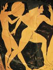 Olympiske leker. 1) Gresk vasemaleri fra 500-tallet f.Kr. som fremstiller en diskoskaster og en løper. Oldtidens olympiske leker kan spores tilbake til ca. 200 år tidligere. Staatliche Antikensammlungen, München. Bildet er hentet fra papirleksikonet Store norske leksikon, utgitt 2005-2007.