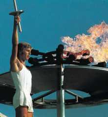 Tenningen av den olympiske ild, i München i 1972. Ilden brenner så lenge lekene varer. Bildet er hentet fra papirleksikonet Store norske leksikon, utgitt 2005-2007.