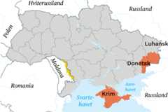 Ukraina vist i grått og oransje. Områder som per januar 2022 var annektert av Russland (Krim), eller del av russiskstøttede utbryterrepublikker er markert i oransje. Den russiskstøttede utbryterrepublikkenTransnistria i Moldova er markert i gult.
