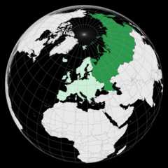 Russland (mørkegrønt) ligger påden nordlige halvkule, og er del av bådeEuropa ogAsia.