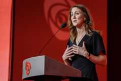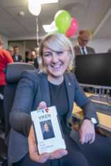 Tidligere fylkesrådsleder Tonje Brenna (Ap) viser fram adgangskortet til sitt kontor i nyeViken fylkeskommune under en velkomstseremoni, 21. oktober 2019.