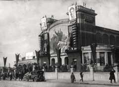 Hovedbygningen ved Kolkhos-markedet i Moskva. Det er en stor markedshall, prydet med propagandabilder, der man i mitdtfeltet ser blant andre Lenin og Stalin. Det hører med til historien at tvangskollektiviseringen i perioder førte til store sosiale problemer og hungersnød.
