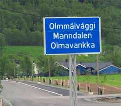 Fleirspråkleg skilt iKåfjord:Olmmáivággi (nordsamisk),Manndalen (norsk),Olmavankka (kvensk)