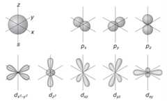Skisse av atomorbitalenes form. Formen beregnes matematisk ved å løse den kvantefysiske Schrödingerlikningen, og beskriver sannsynligheten for at elektronet befinner seg et gitt sted i atomet. Den sirkulære formen til s-orbitalen uttrykker at alle steder rundt atomkjernen er like sannsynlige med tanke på hvor elektronet befinner seg.