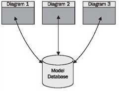The model database is what fundamentally differentiates aCASE tool from a graphical program (Figure 2.6). Any UML diagram can be generated easily with paper and pencil or a graphical program. In this case, however, the various diagrams are nothing more than drawings. Only the use of aCASE tool with a database, according to UML specifications, permits consistent collection, management, and modification of model information.