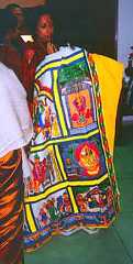 There is a specific class of Yama orJadu (Magic) pats, designed largely for the Santal tribespeople, in which the dead are endowed with sight by means of magic. But the stories generally told in scroll paintings are derived from theRamayana, the Mahabharata, thepuranas, or other mythological lore and folk tales which are sometimes specific to Bengal, such as tales about the snake-goddess, Manasa. The Krishna-Radha legends are a favorite subject matter for the pats, as are tales about Shiva and his consort Parvati; but by no means are all the stories derived from religious or mythological literature. Sometimes the subjects are derived from social and political issues of the day, or are intended to satirize prevalent social mores. As the accompanying slide show of one pat suggests, even topics like AIDS have reached the attention of patuas. Some observers have suggested that the art of the patua is rapidly disappearing, and certain the advent of cinema and cable television has jeopardized a great many traditional art forms. However, like many other predictions made of Indian conditions, this one is far from being fulfilled at the present moment, and it is possible that amidst the technological innovations and splendors of our times, some people may yet discover the simpler pleasures of life.