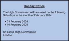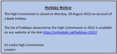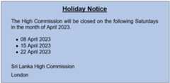 The High Commission of Sri Lanka in the UK receives requests for organizing mobile Consular Services outside London for the convenience of those who live away from London.