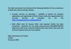 இங்கிலாந்திலுள்ள இலங்கைக்கான உயர்ஸ்தானிகராலயத்தின் கொன்சியூலர் பிரிவின் அனைத்து கொன்சியூலர் சேவைகளும் (கடவுச்சீட்டு, இரட்டை பிரஜாவுரிமை, பிறப்புக்களை பதிவுசெய்தல், சட்டரீதியான மற்றும் பிரமாணப்பத்திரங்களில் கையெழுத்திடுவது உள்ளிட்ட ஆவணங்களை சட்டபூர்வமாக்குதல்) கட்டாயமாக முன்னனுமதியினைப் பெற்று விண்ணப்பங்களினை சமர்ப்பிக்கவேண்டும்.