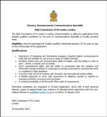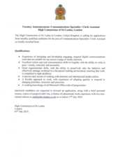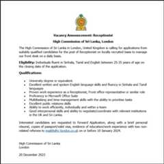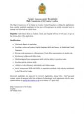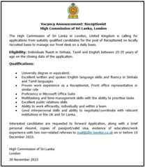 Vacancy Announcement : Receptionist High Commission of Sri Lanka, London
