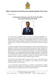 Congratulatory Statement on Dr. Hareen De Silva BEM Receiving the Humanitarian Medal