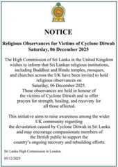 The High Commission of Sri Lanka in the United Kingdom invited Sri Lankan religious institutions across the UK to hold observances on 6 December 2026 in memory of the victims of Cyclone Ditwah and to offer prayers for healing and the recovery of affected communities. Observances were held at Buddhist temples such as London Buddhist Vihara, Kingsbury Buddhist Vihara (organised by the Ranwala Foundation), Athula Dassana International Buddhist Temple, Thames Buddhist Vihara, Birmingham Buddhist Maha Vihara, and Jethavana Buddhist Viharaya, as well as at other religious institutions including Ealing Hindu Temple, Sri Lankan Catholic Chaplaincy and the Sri Lanka Muslim Cultural Centre (SLMCC), Harrow, (in association with the Council of Sri Lankan Muslim Organisations COSMOS UK). High Commission representatives joined some of these events to convey solidarity and support, while numerous other temples, mosques, churches, and religious centres across the UK conducted their own observances during the weekend.