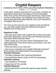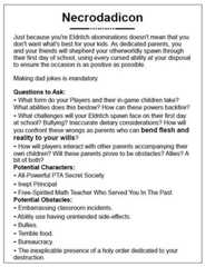 7-14-17: This update brings the total number of Session Starters over 20 with 5 new scenarios. Go to a barbecue as aliens wearing the skin of a suburban family in 1950s America! Take your eldritch spawn to their first day of school inNecrodadicon!